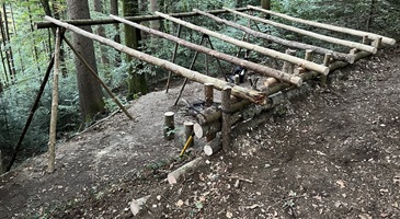 5. Nun werden die Dachträger platziert, die lediglich eine Plane tragen sollen. "Für mich sehr wichtig: Alles wird ausschliesslich aus totem Holz gefertigt – kein lebender Baum soll für dieses Projekt sein Leben lassen." (06. Okt. 2025)