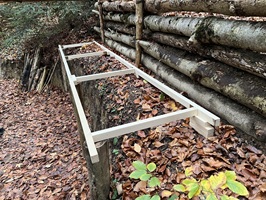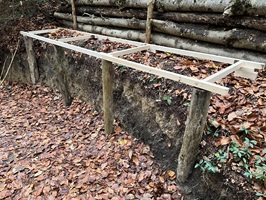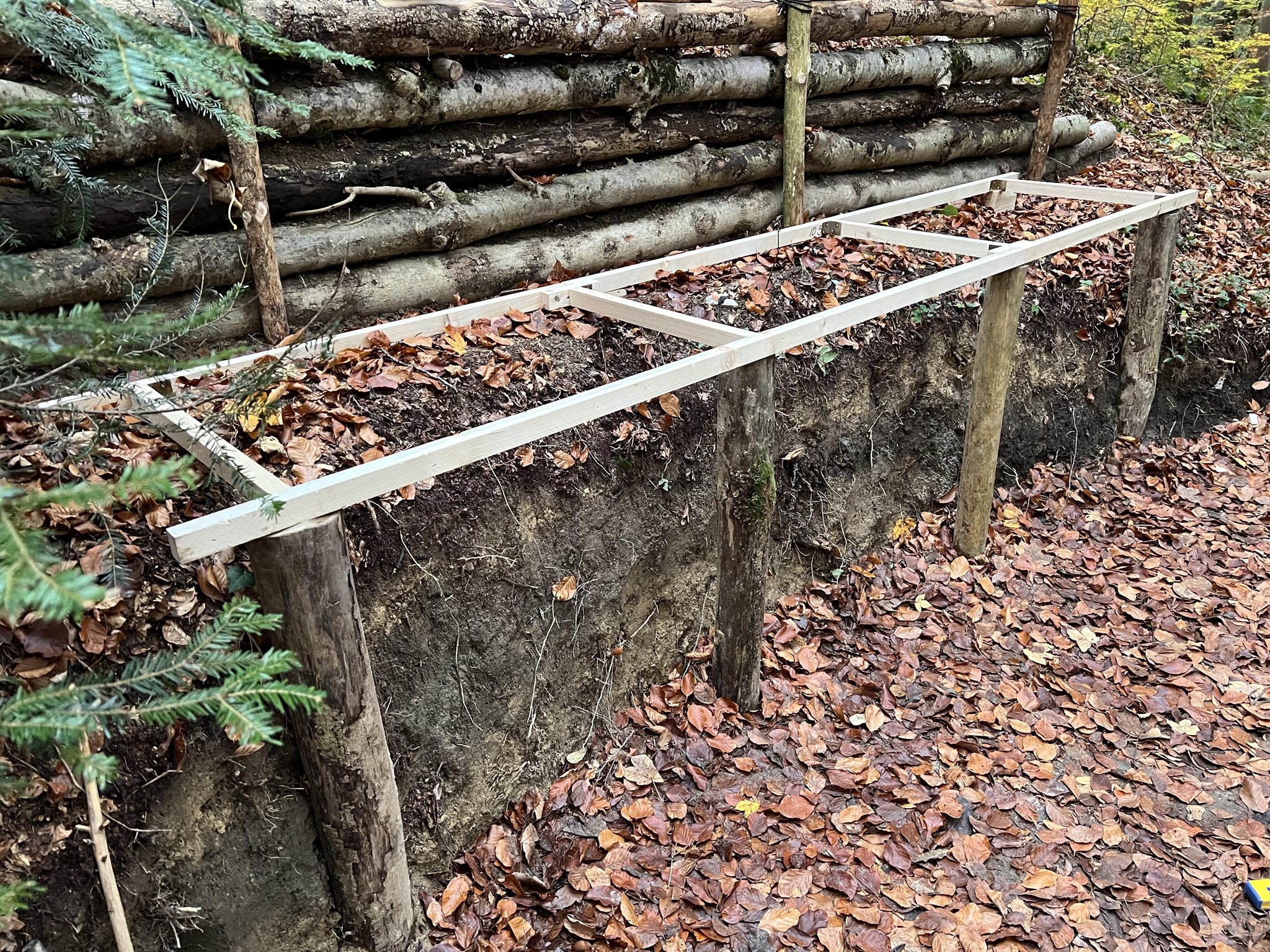 4. Zweite Stütze in Form einer waagrechten Palisade. Sie bietet Schutz vor dem Absinken der Erde und dient zugleich als zusätzliche Wand bzw. Stütze für die Dachträger. (06. Okt. 2025)
