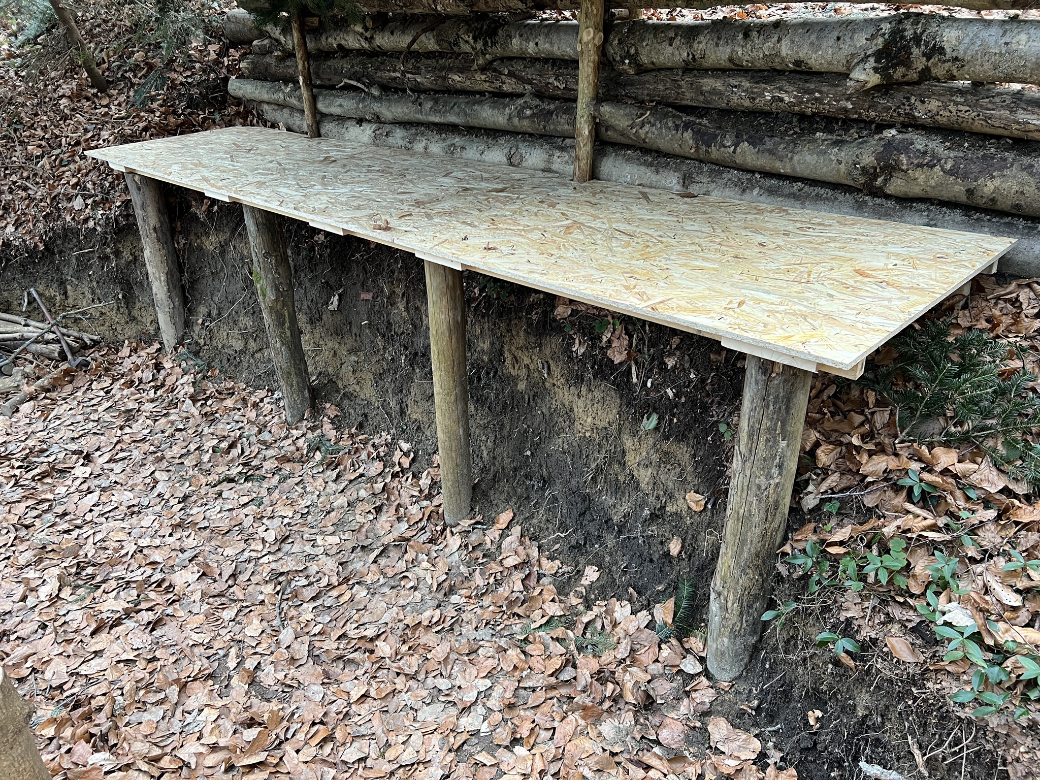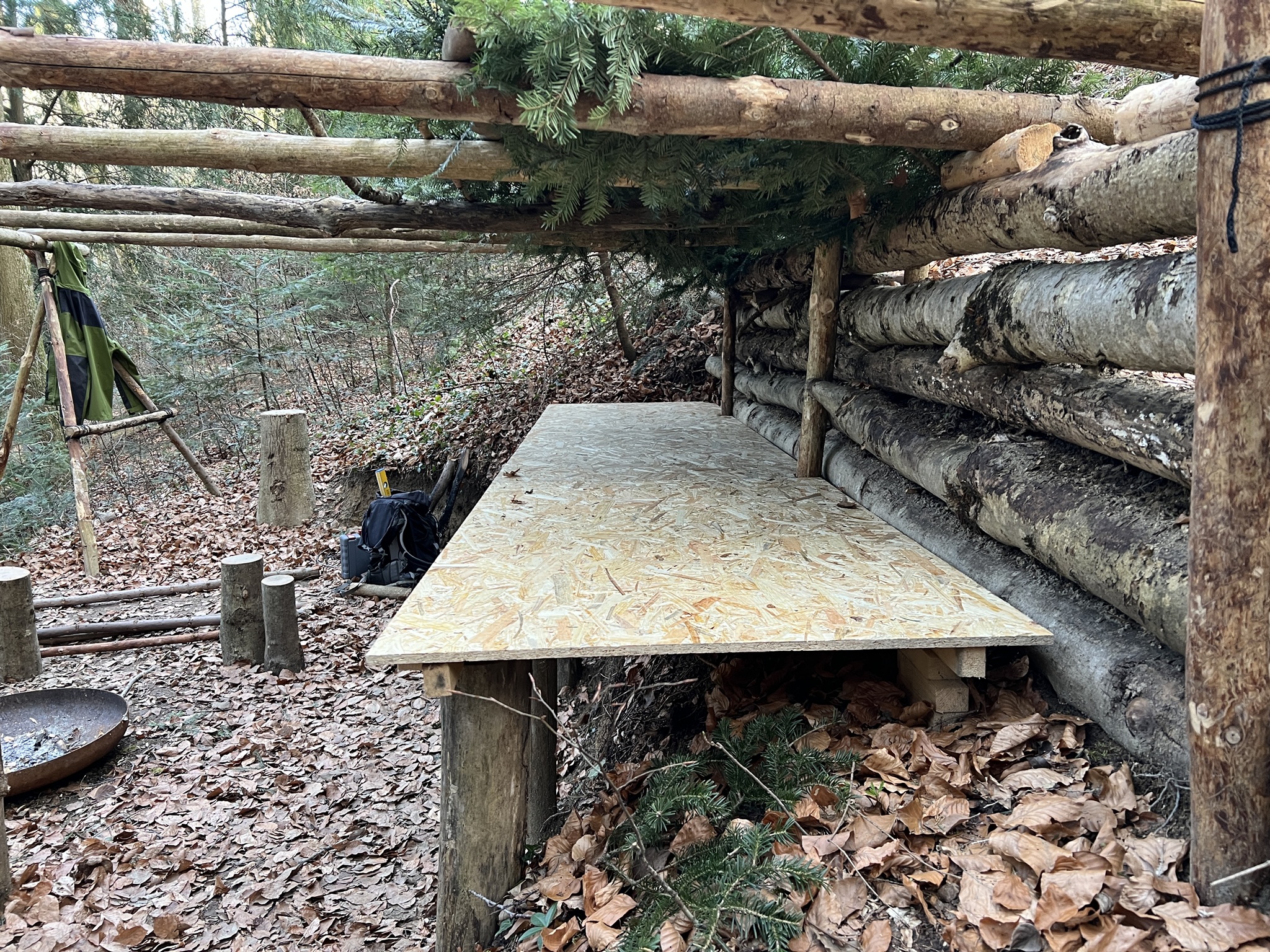 Nun werden die Dachträger platziert, die lediglich eine Plane tragen sollen. "Für mich sehr wichtig: Alles wird ausschliesslich aus totem Holz gefertigt – kein lebender Baum soll für dieses Projekt sein Leben lassen."