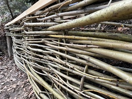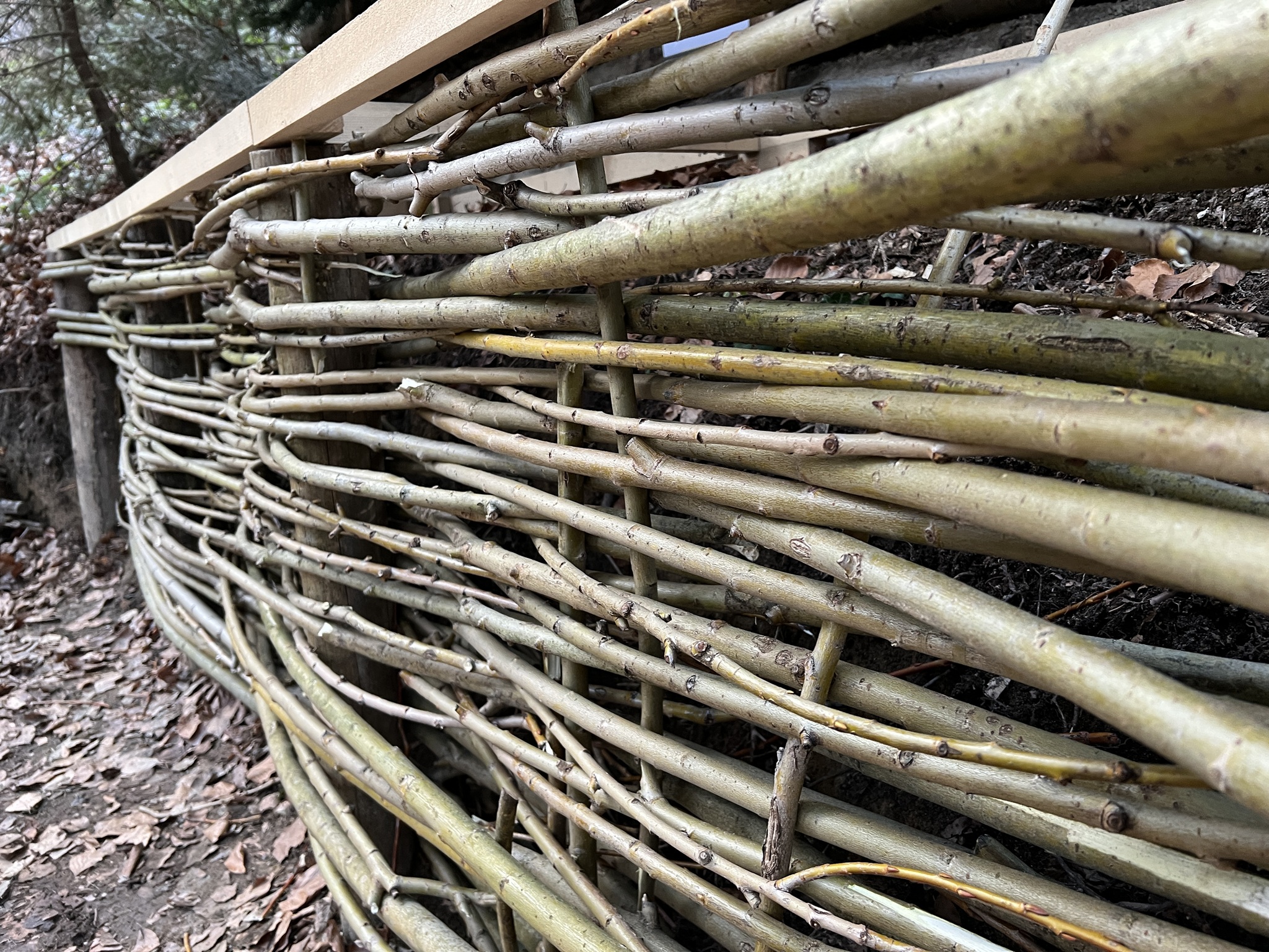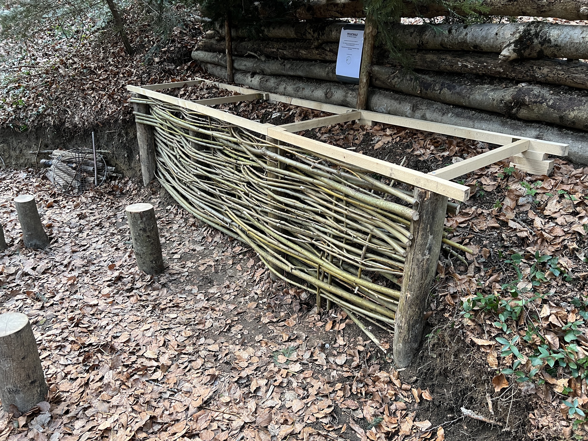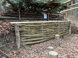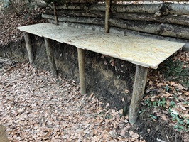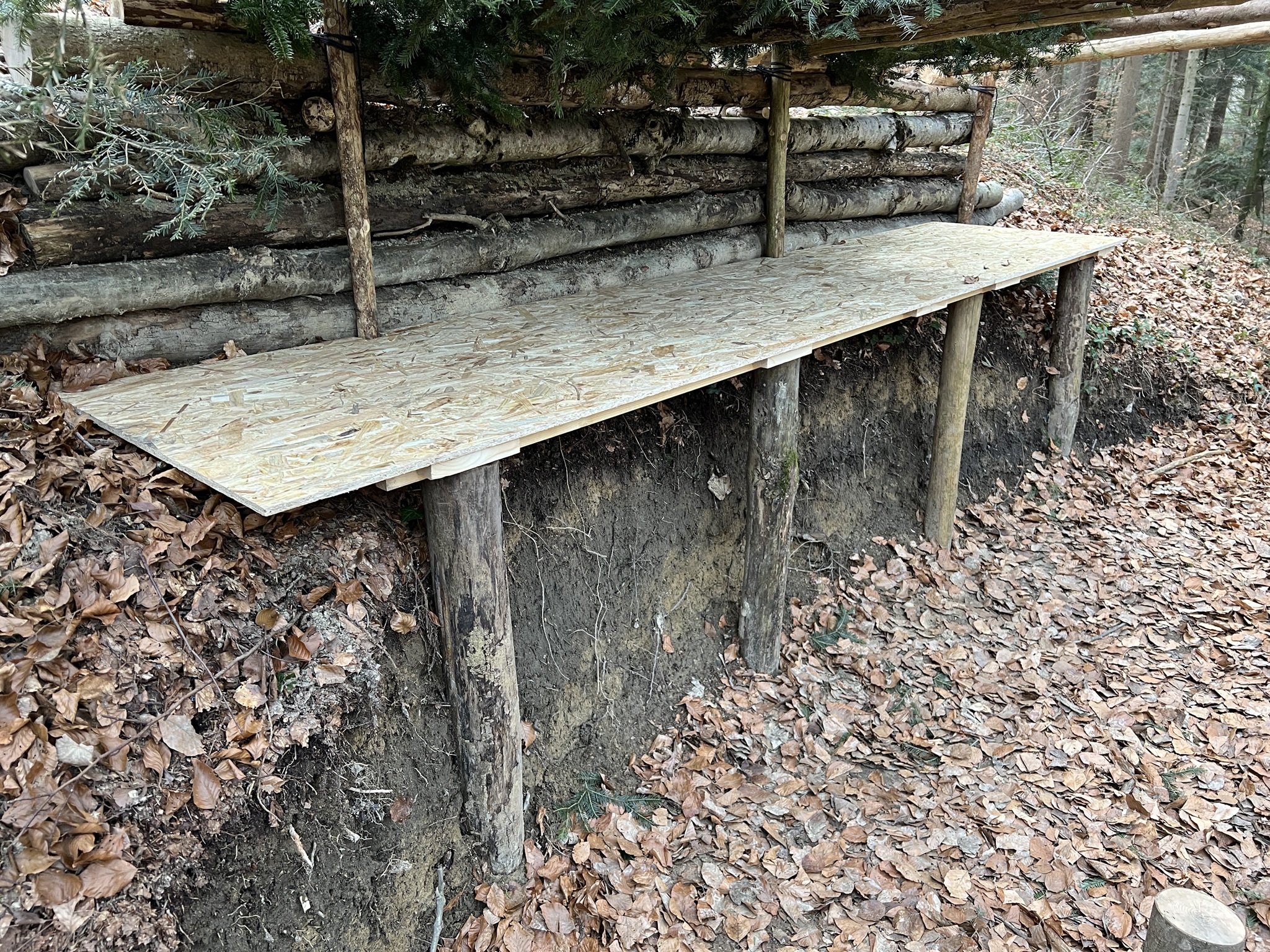 Zweite Stütze in Form einer waagrechten Palisade. Sie bietet Schutz vor dem Absinken der Erde und dient zugleich als zusätzliche Wand bzw. Stütze für die Dachträger.