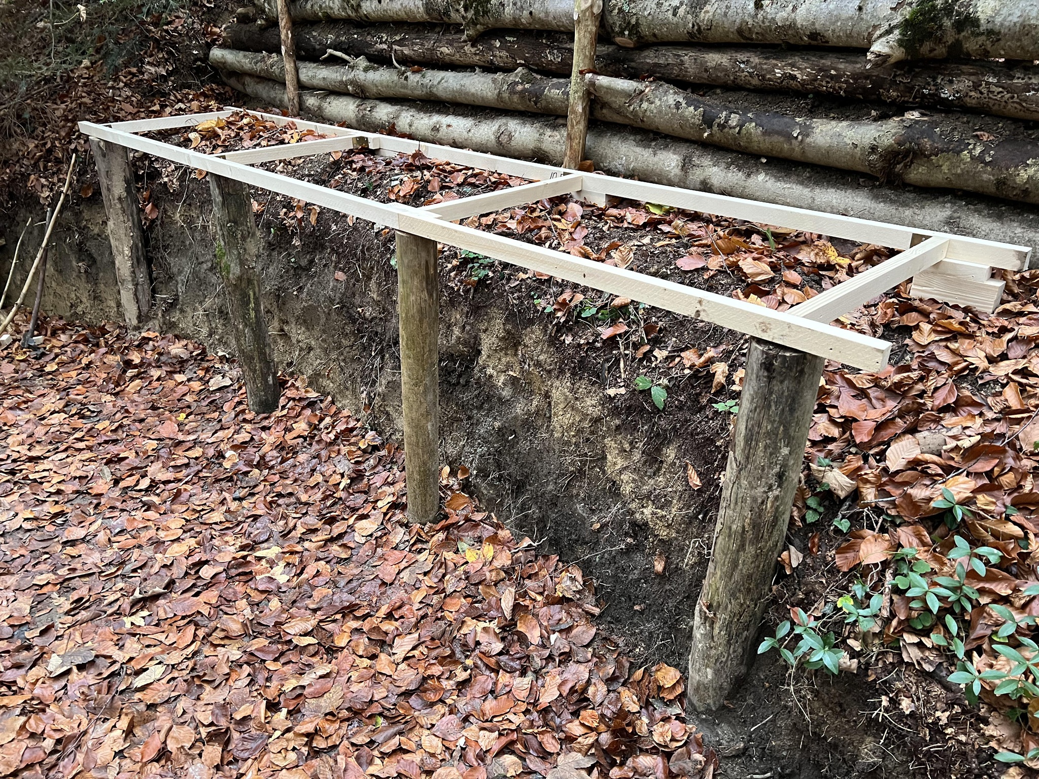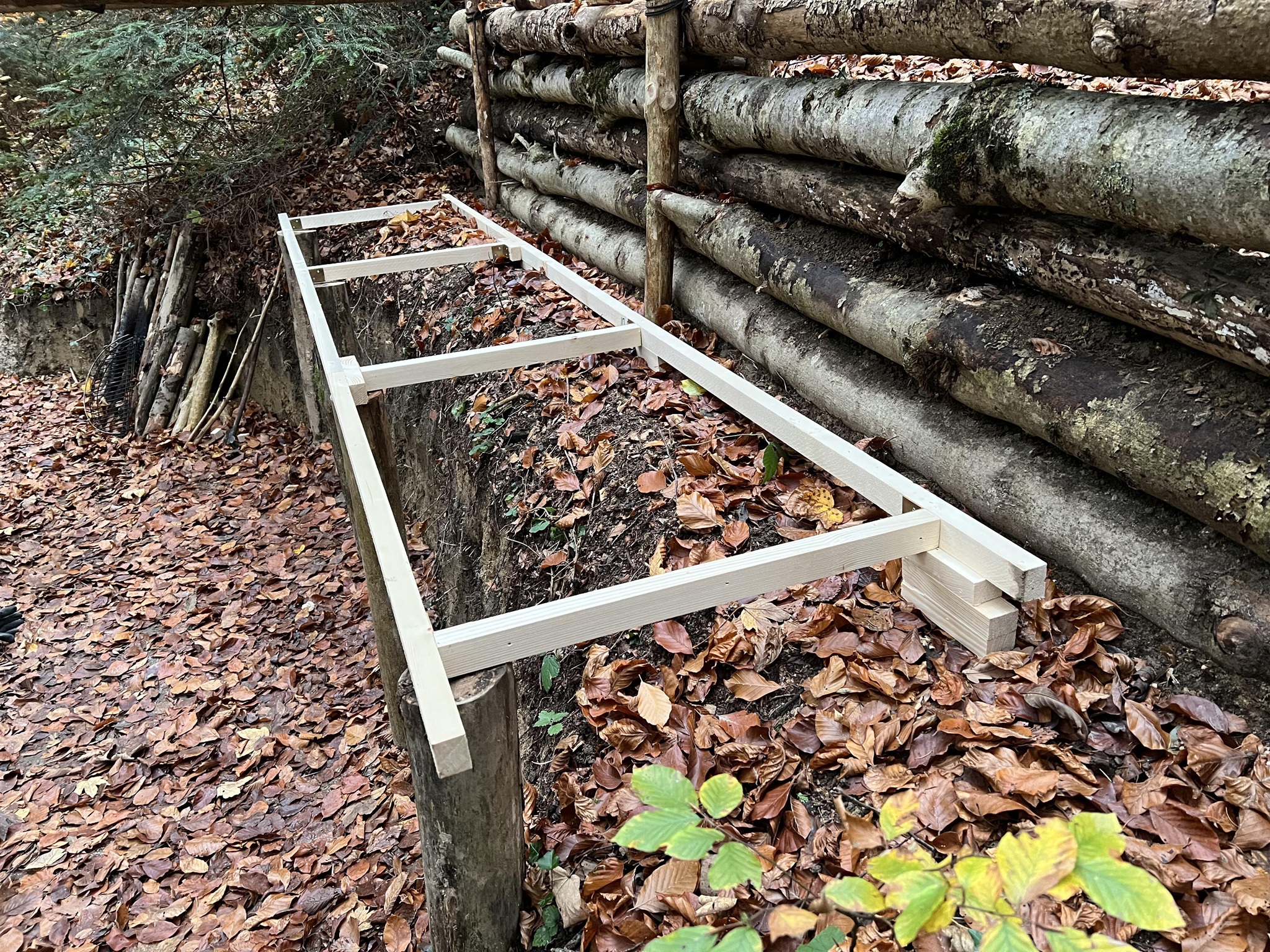 4. Zweite Stütze in Form einer waagrechten Palisade. Sie bietet Schutz vor dem Absinken der Erde und dient zugleich als zusätzliche Wand bzw. Stütze für die Dachträger. (06. Okt. 2025)